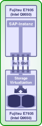 Die SAP-Performance-Tests wurden auf einem/zwei Fujitsu E7935 (Quad Core CPU - Q9550) durchgeführt. Als Referenz wurde auf einer Maschine SAP auf zwei lokalen Festplatten verteilt installiert. Bei diesem Setup wurde darauf geachtet, die Filesysteme der Archive/Logs auf Platte A abzulegen. Die sapdata-Filesysteme auf wurden auf Platte B untergebracht. Dieser SAP-Referenz-Installation stellen wir die Anbindung von SAP an ebenfalls zwei Festplatten, nun aber per RSIO und OSL-Speichervirtualisierung, gegenüber: